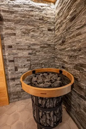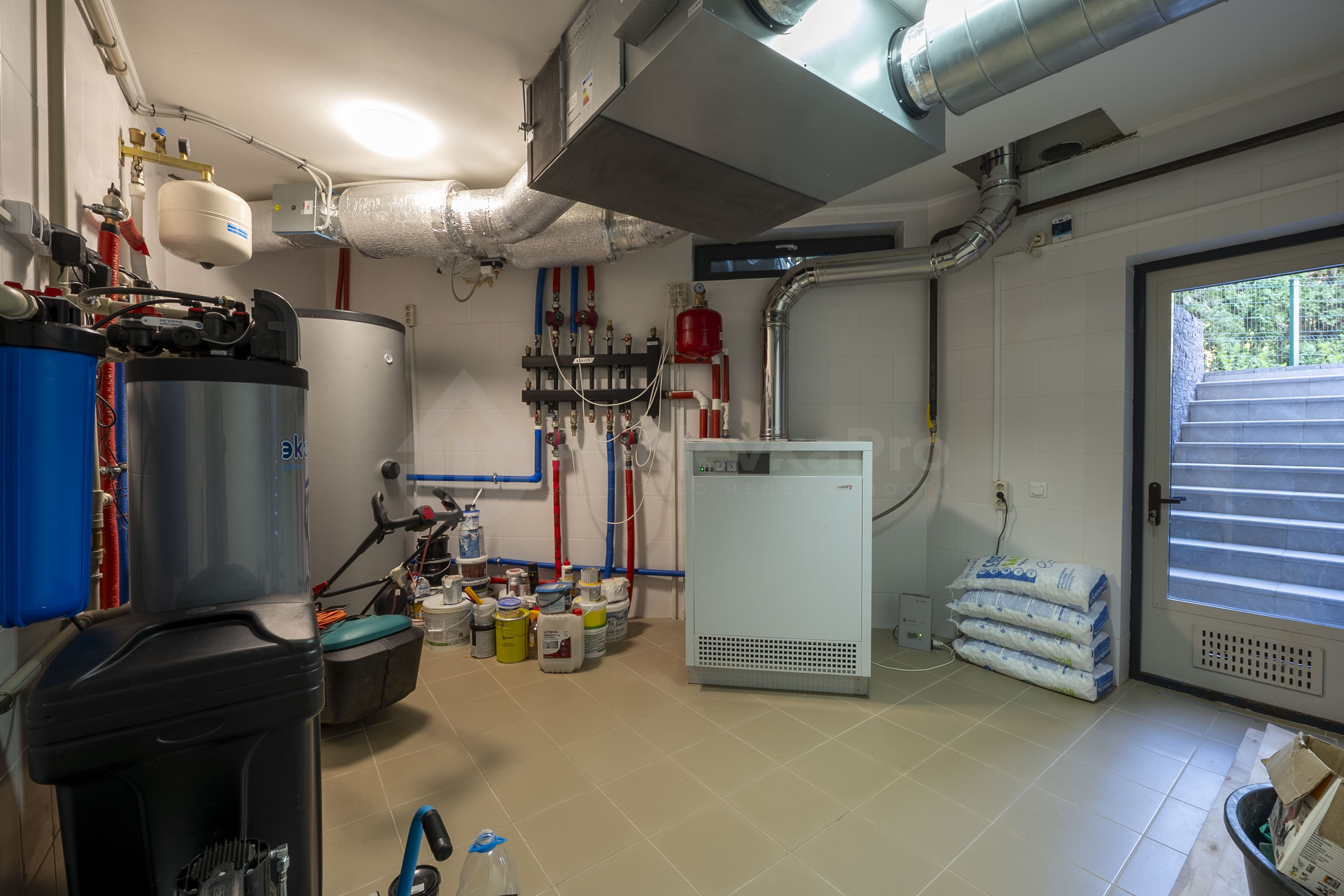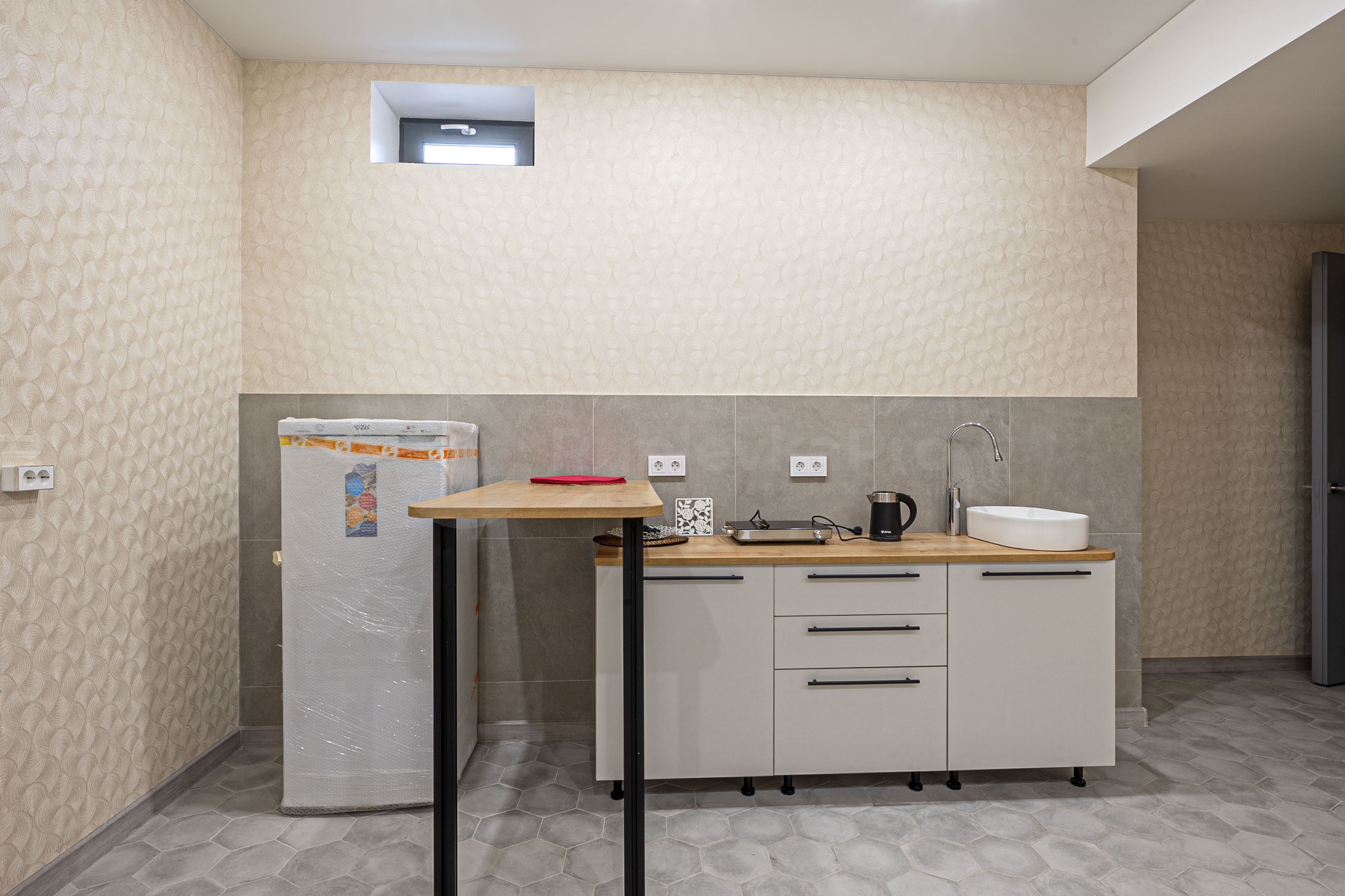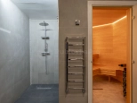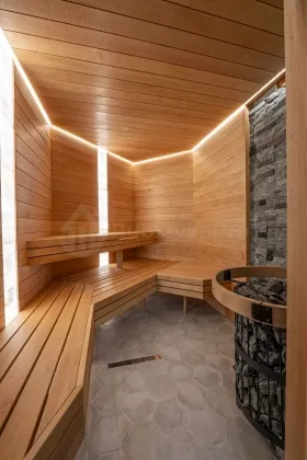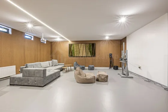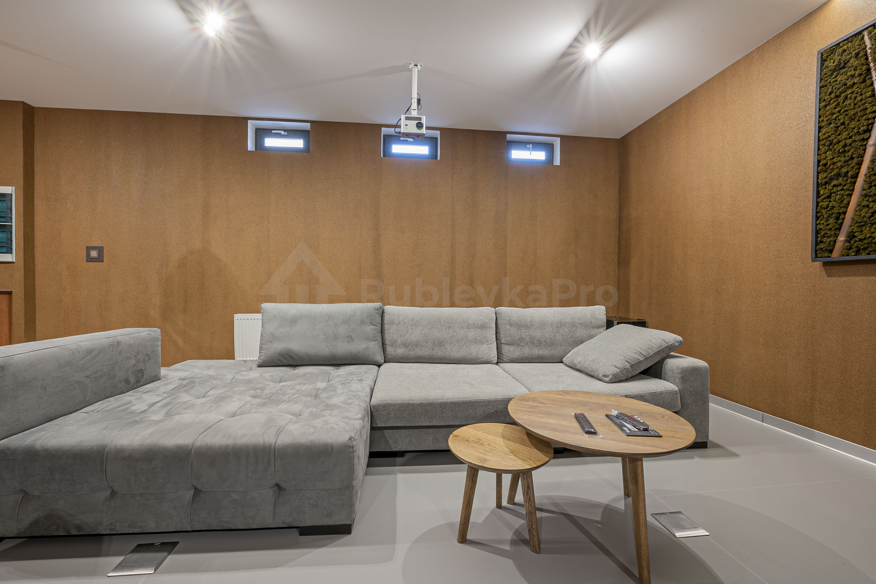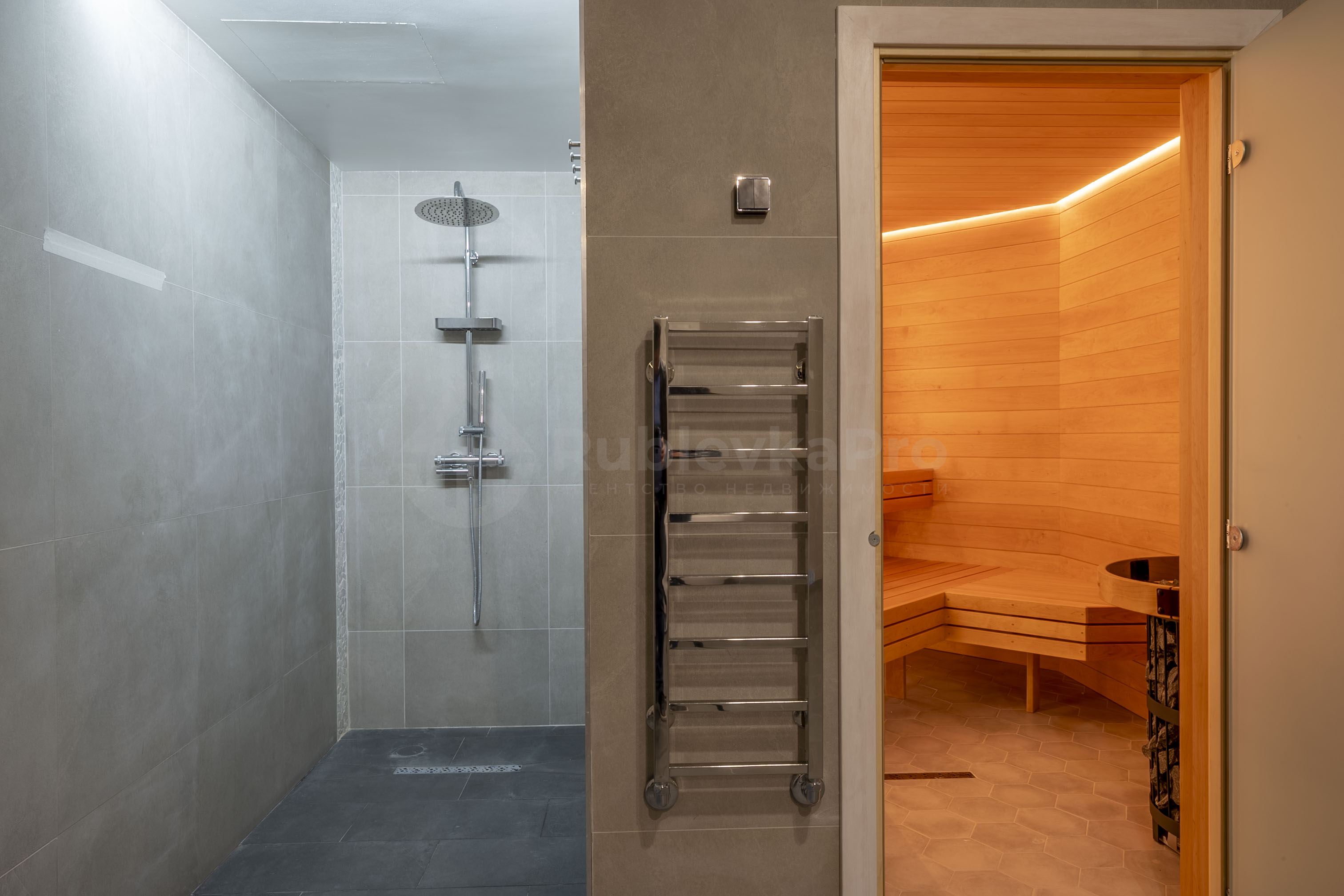Полноценная зона релаксации и комфорта: спа-зона с сауной и джакузи, домашний кинотеатр для семейных вечеров. Здесь же расположены технические помещения и отдельная комната для персонала с местом для приготовления пищи — все организовано так, чтобы не пересекаться с хозяйской зоной.