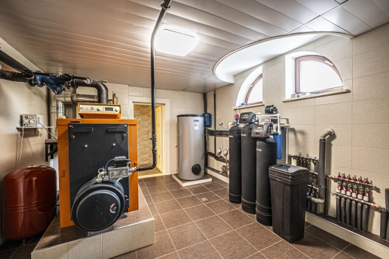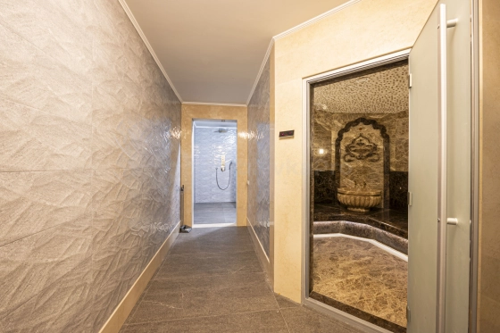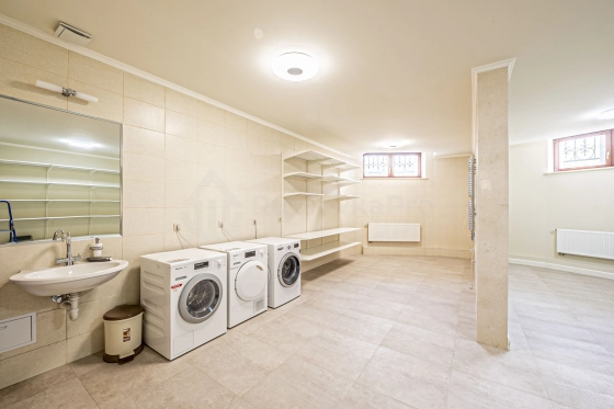 На цокольном этаже оборудованный спортивный зал, хамам, душевая, большая постирочная комната со стиральными, сушильными машинами, со стеллажами, гладильная зона, санузел, котельная.