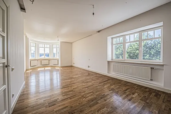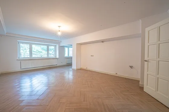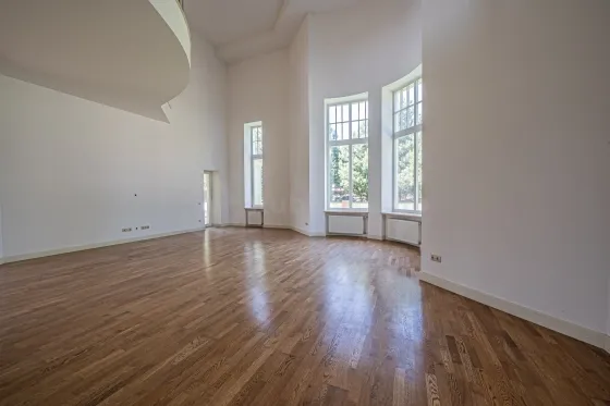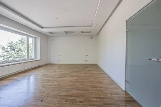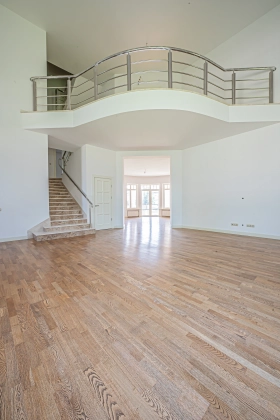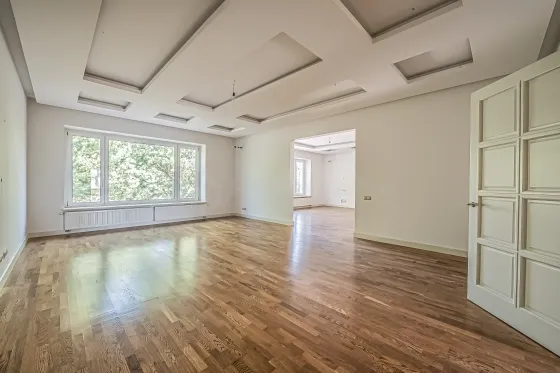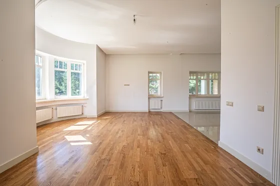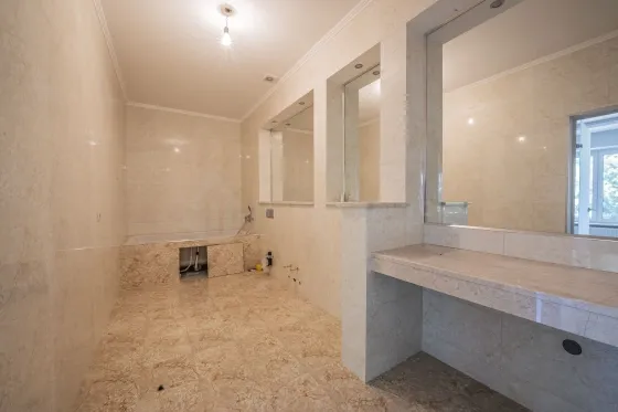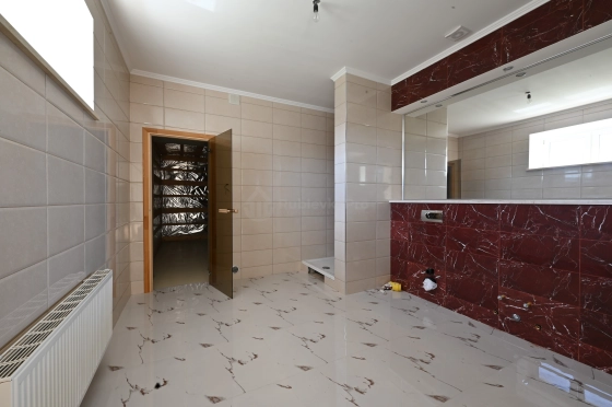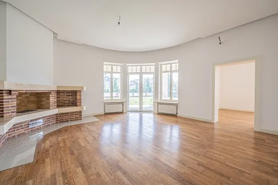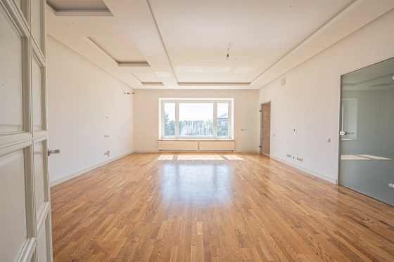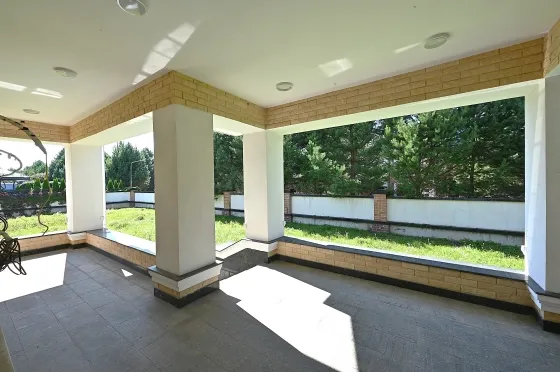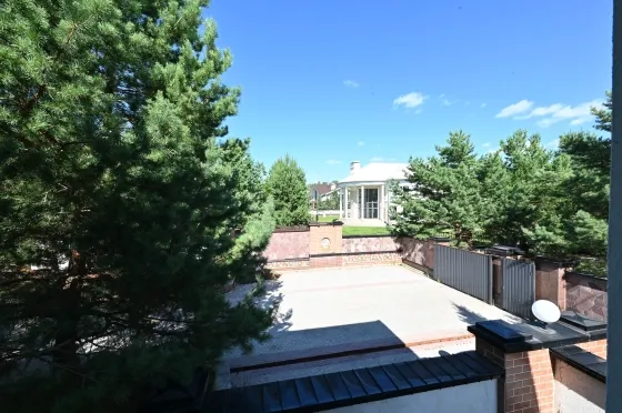 В доме большая гостиная со вторым светом и выходом на террасу, каминная, кухня-столовая, большая прихожая. Также на первом этаже расположен гостевой санузел, гостевая комната /комната персонала с кухней и санузлом, постирочная, газовая котельная с современным газовым котлом, гараж на 6 автомобилей.