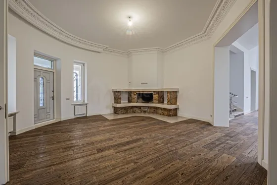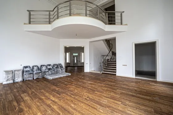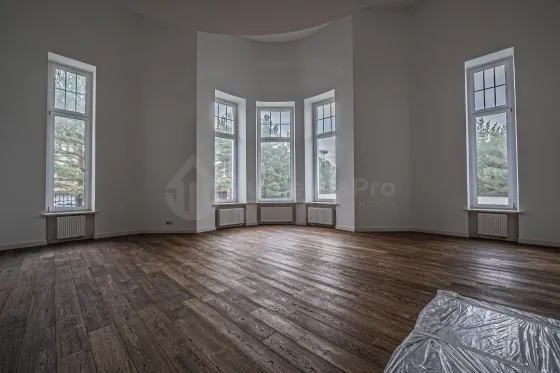 Планировка:1 этаж: большая прихожая, просторная гостиная со вторым светом и большими арочными окнами, каминный зал, столовая, кухня, гостевой санузел, гостевая спальня с санузлом, постирочная, два выхода на террасы, гараж на 5 автомобилей. 2 этаж: четыре спальни со своими гардеробными и санузлами, выход на балкон-терассы. Мансардный этаж: спальня, помещение свободного назначения, где можно устраивать театральные постановки. Цокольный этаж: предусмотрен спа-центр, бойлерная, помещение свободного назначения. Участок правильной формы, огорожен, по периметру растут взрослые сосны. Перед домом парковка на несколько автомобилей.