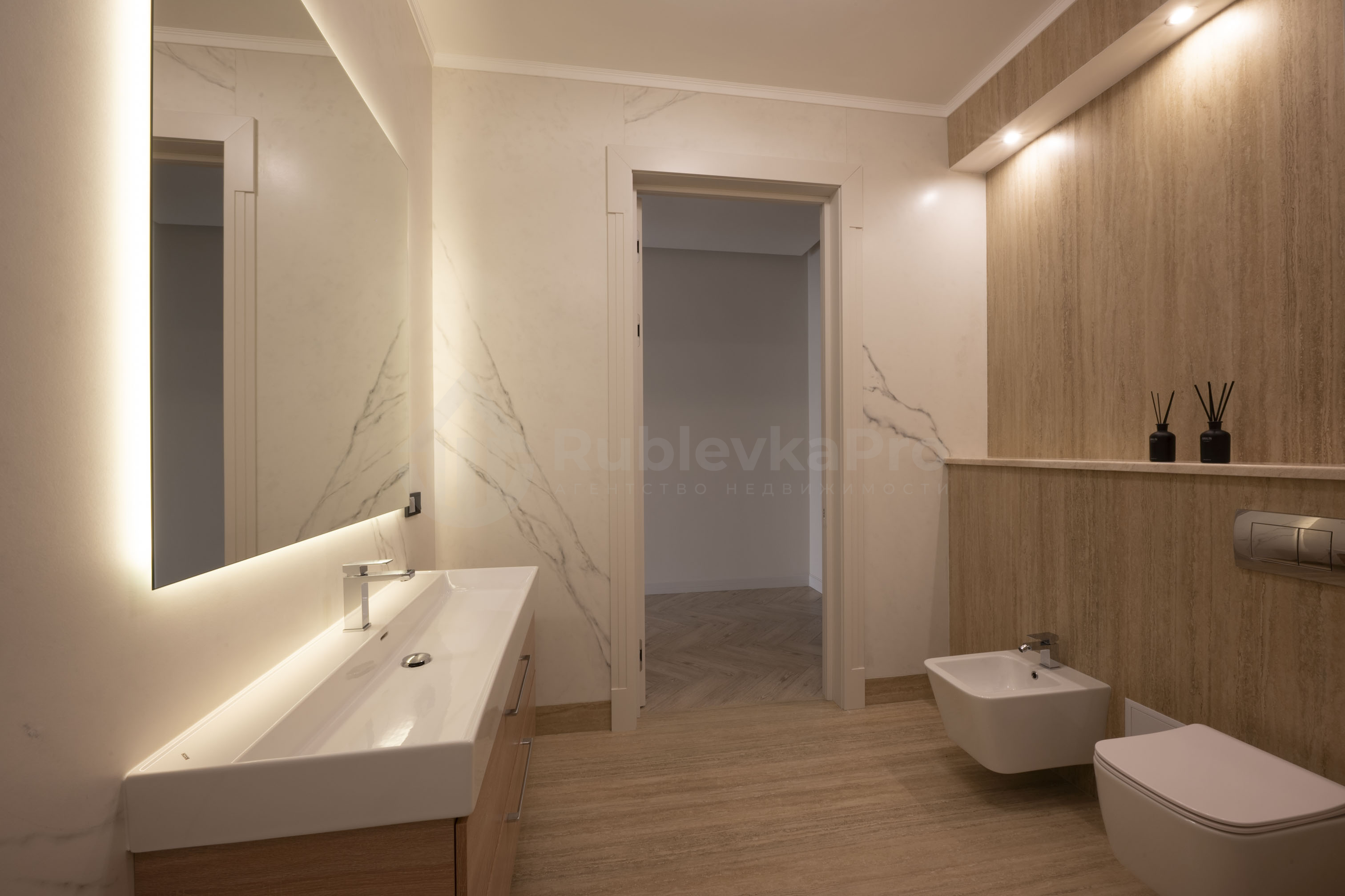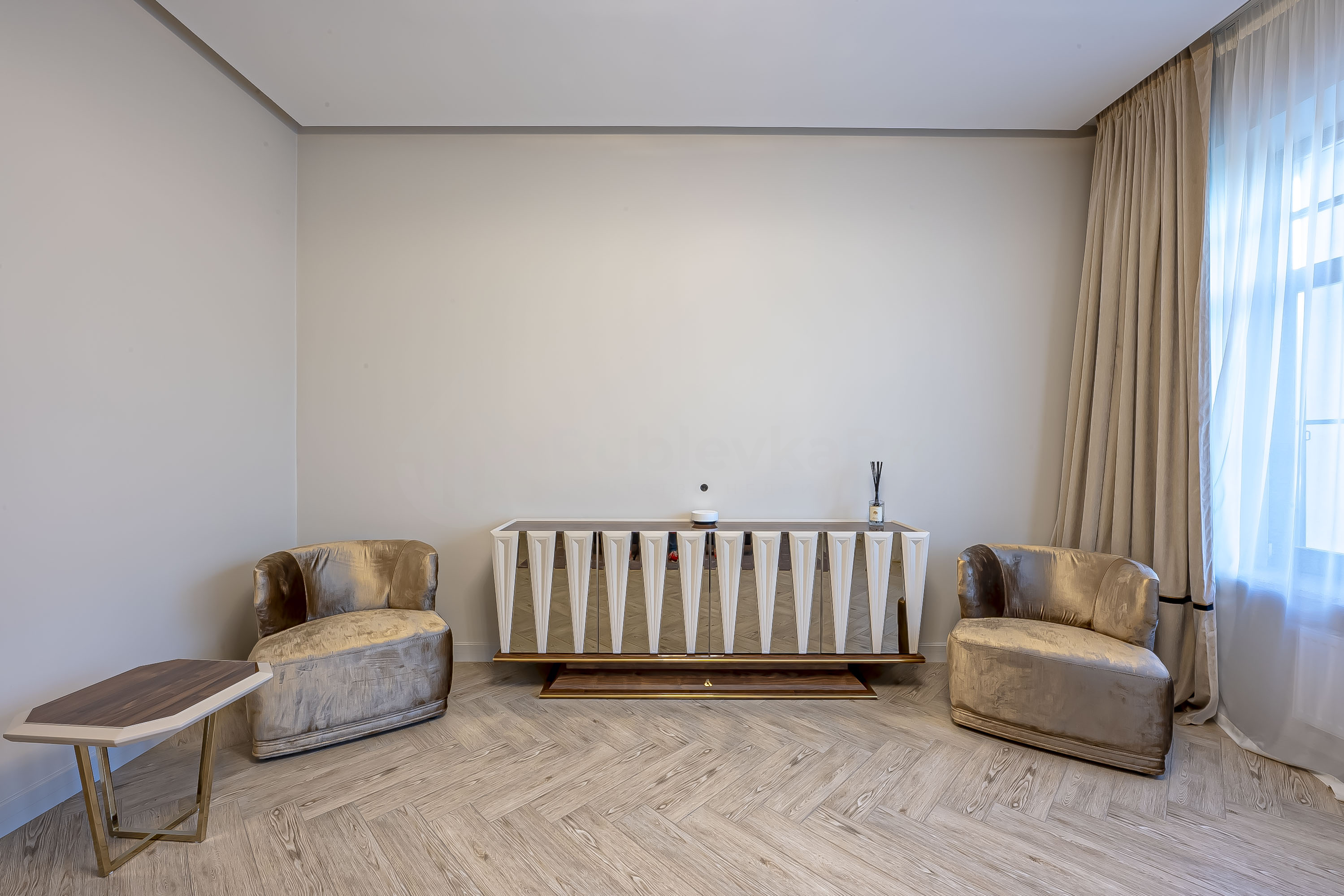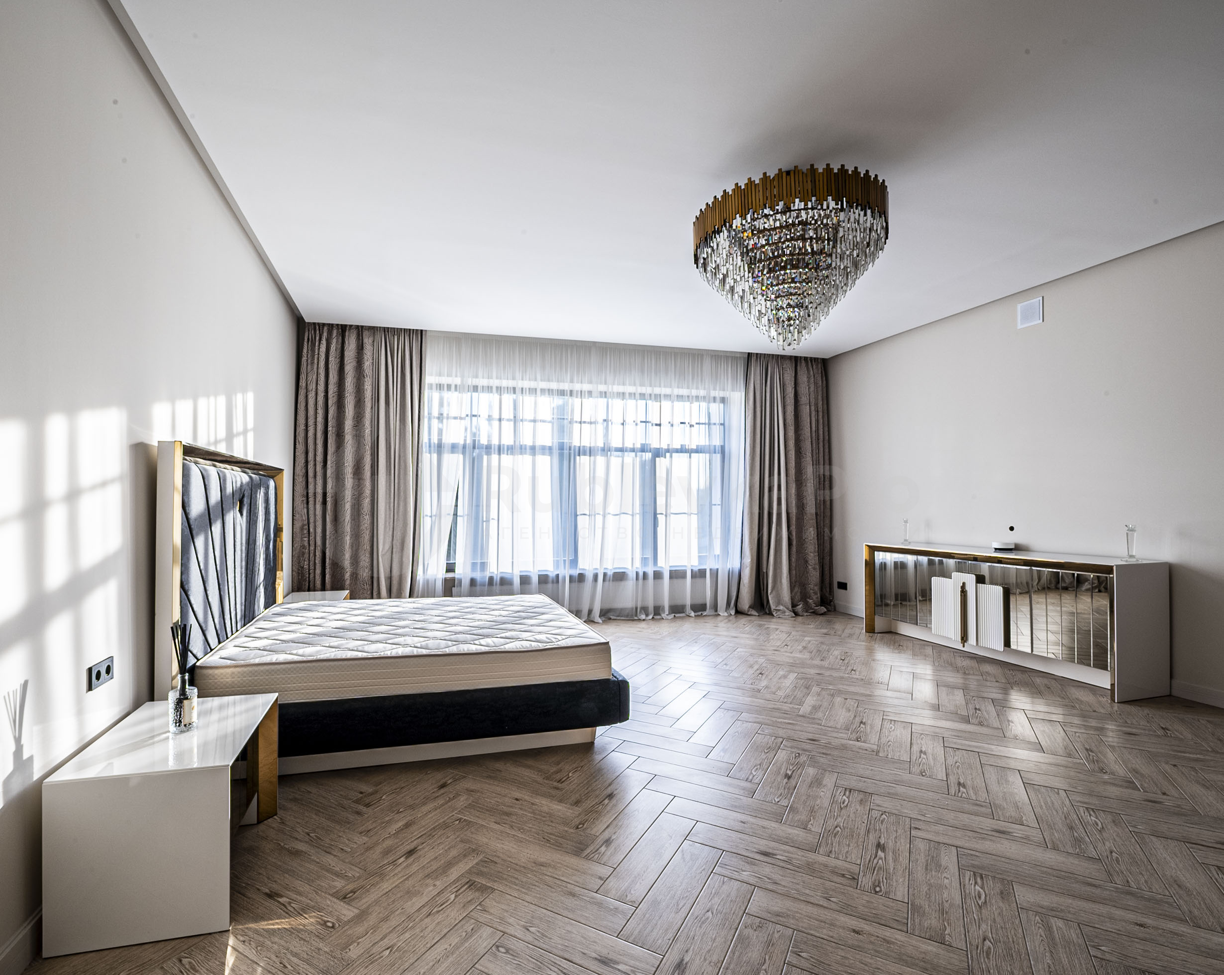 Поднимаясь по лестнице на 1 пролет Вы попадаете в зону отдыха, где расположены полностью меблированная спальня со своим санузлом и гардеробной комнатой, кабинет со своим санузлом.