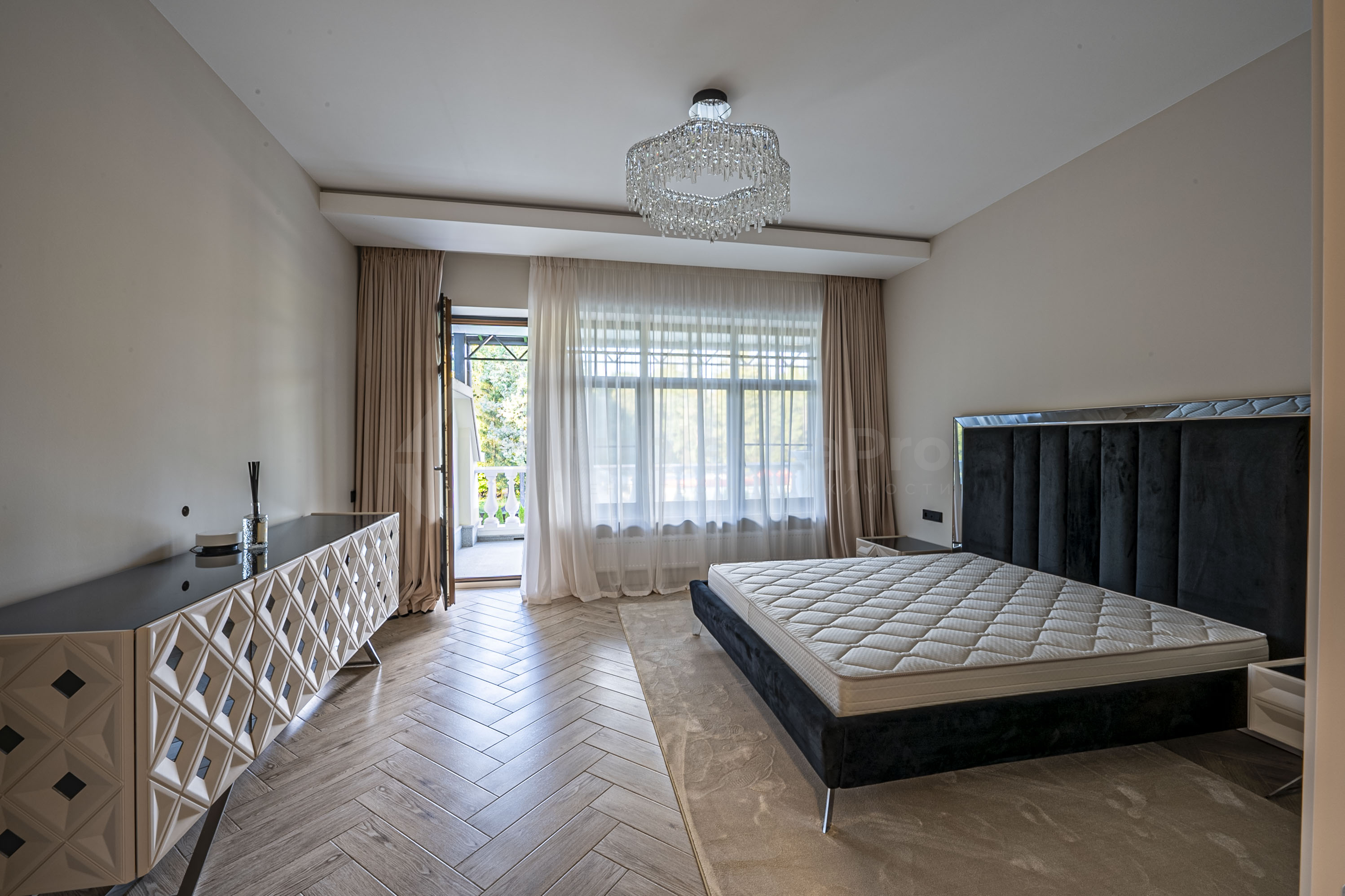 На втором этаже расположены большая гардеробная комната, спальня с выходом на большой балкон, где с утра, попивая чашку кофе наслаждаешься тишиной, которую прерывает пение птиц. В спальне свой санузел.