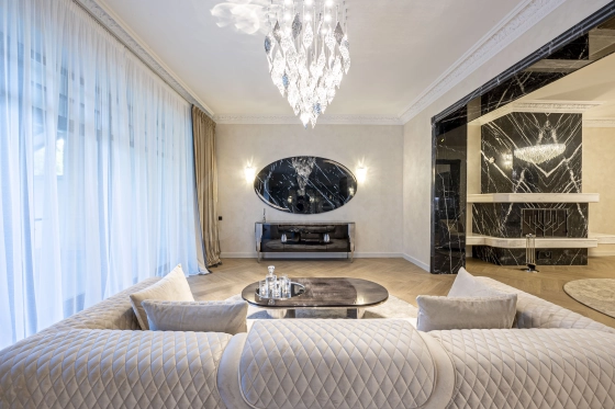 И далее попадаешь на третий этаж, где две гостевые зоны и еще одна меблированная спальня с санузлом и гардеробной комнатой.