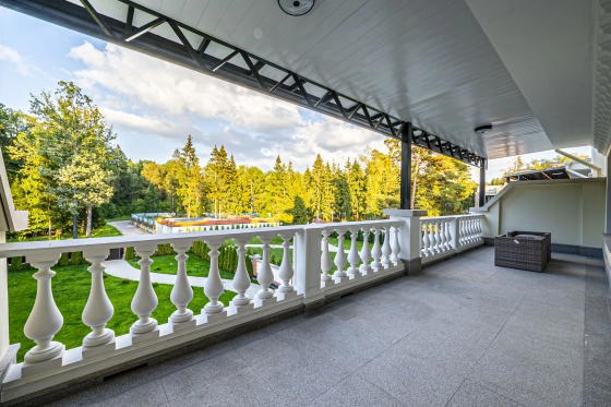 Столовая с панорамными окна и с выходом на террасу, где можно также расположиться на свежем воздух в уютной компании близких и друзей. И наблюдать собственный светлый зеленый участок, с уже установленным автомолитом, посаженными взрослыми деревьями. а также наблюдать лес и дышать чистейшим воздухом, и при желании всегда можно выйти и погулять по лесу, заниматься на спортивной площадке, расположенной под сенью вековых елей.