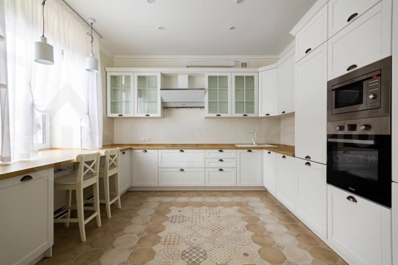 Продам светлый дом 354,1 м2 на зеленом участке 13 сот.. В доме большая гостиная -столовая с выходом на террасу и участок, кухня, оборудованная всей необходимой техникой западных брендов, гостевая спальня, гардеробная комната, гостевой санузел, бойлерная., гараж на два автомобиля. Перед гаражом есть также парковка на два автомобиля.