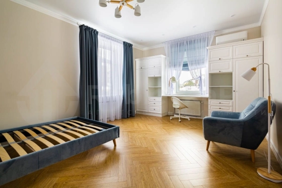 На втором этаже расположены мастер-спальня со своим санузлом и гардеробной комнатой, две детские комнаты с игровым холлом, кабинет/спальня, гардеробная комната, санузел.