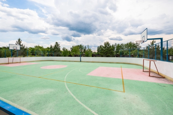 На светлом участке газон, установлена площадка под барбекю, футбольные ворота.