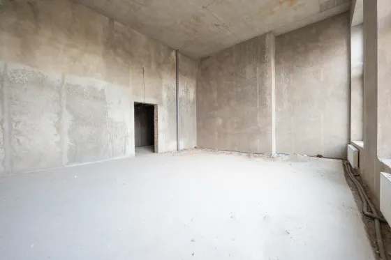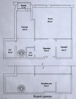 - Первый уровень: кухня-гостиная 58 м², спальня, с потолками более 6 метров, два санузла.