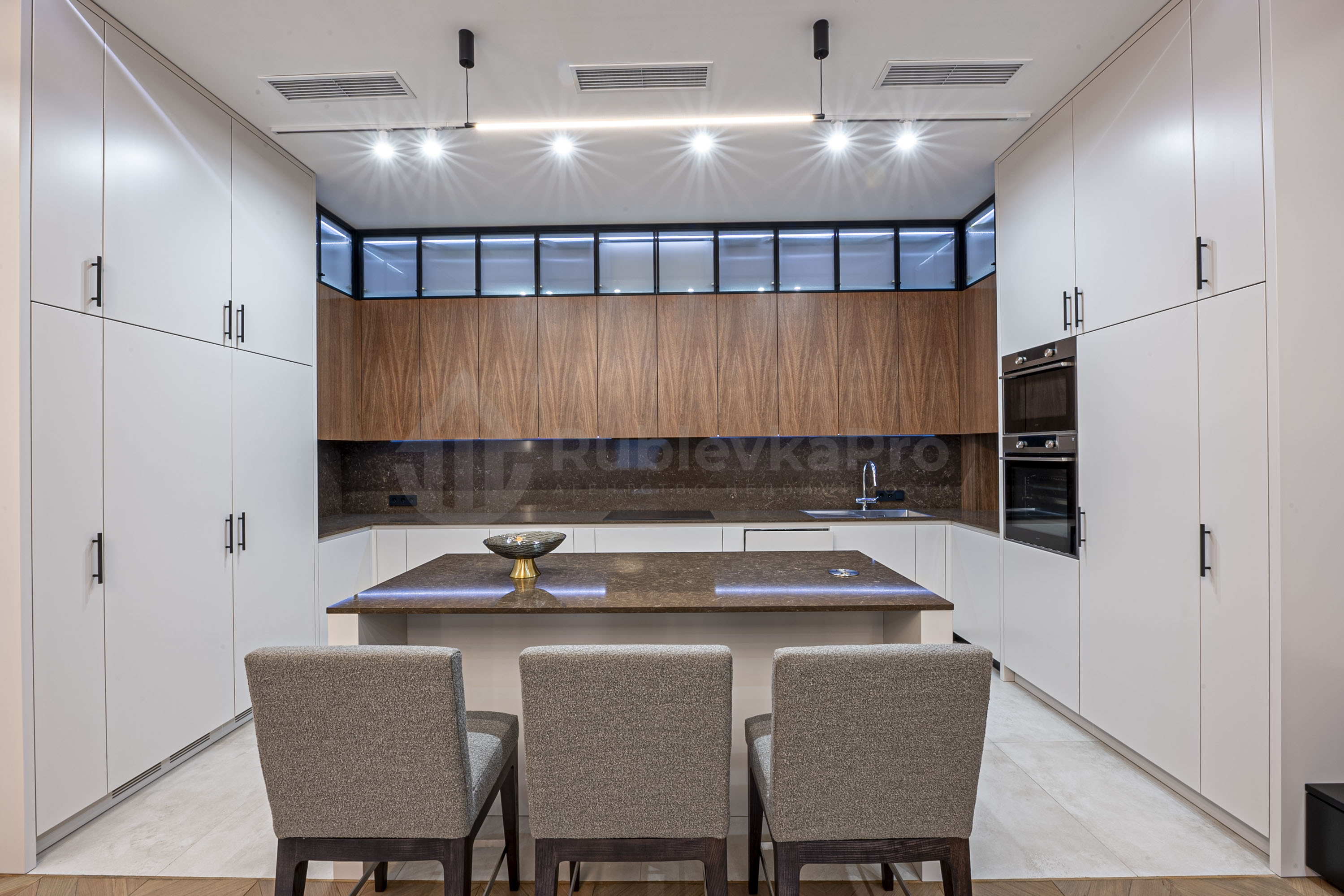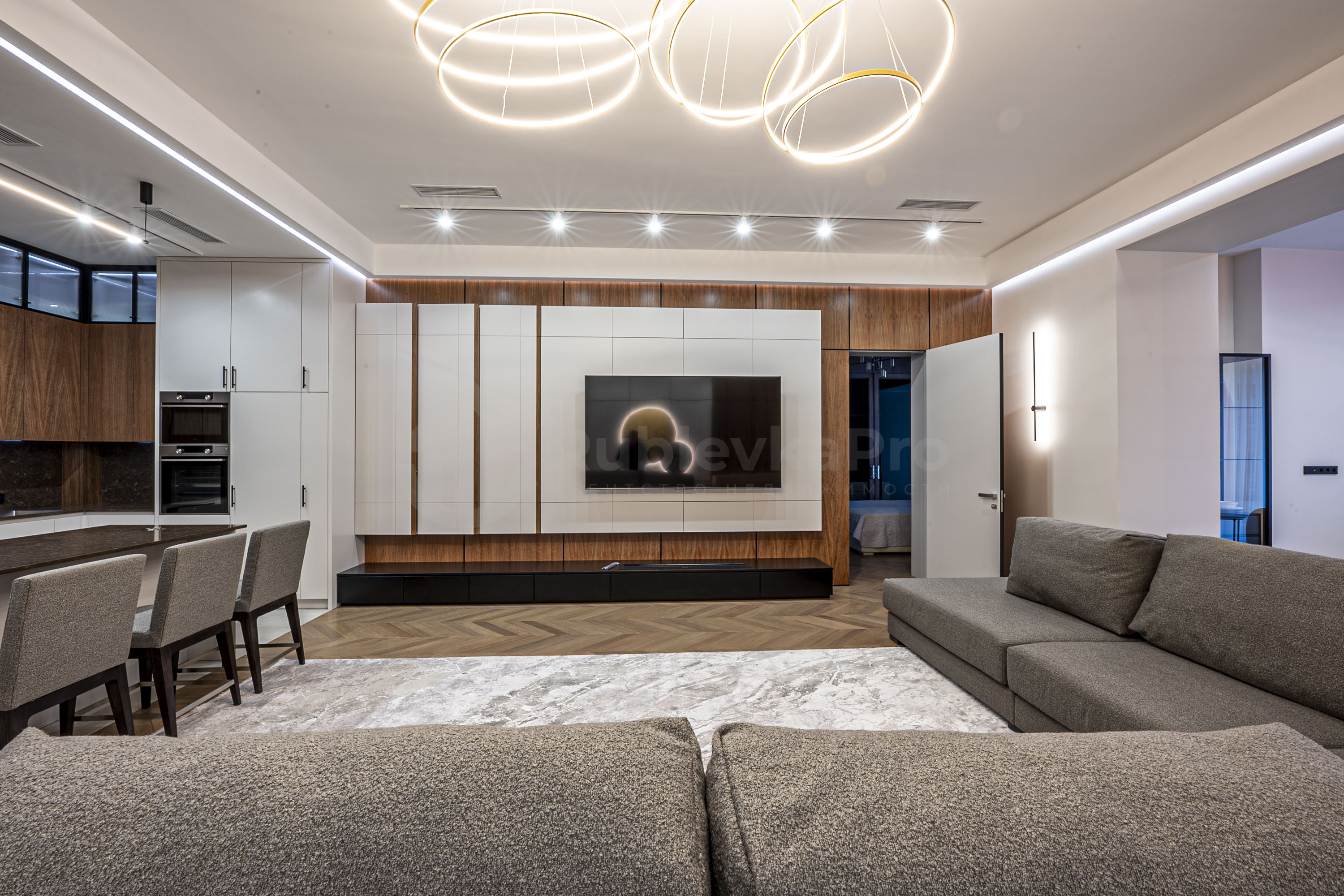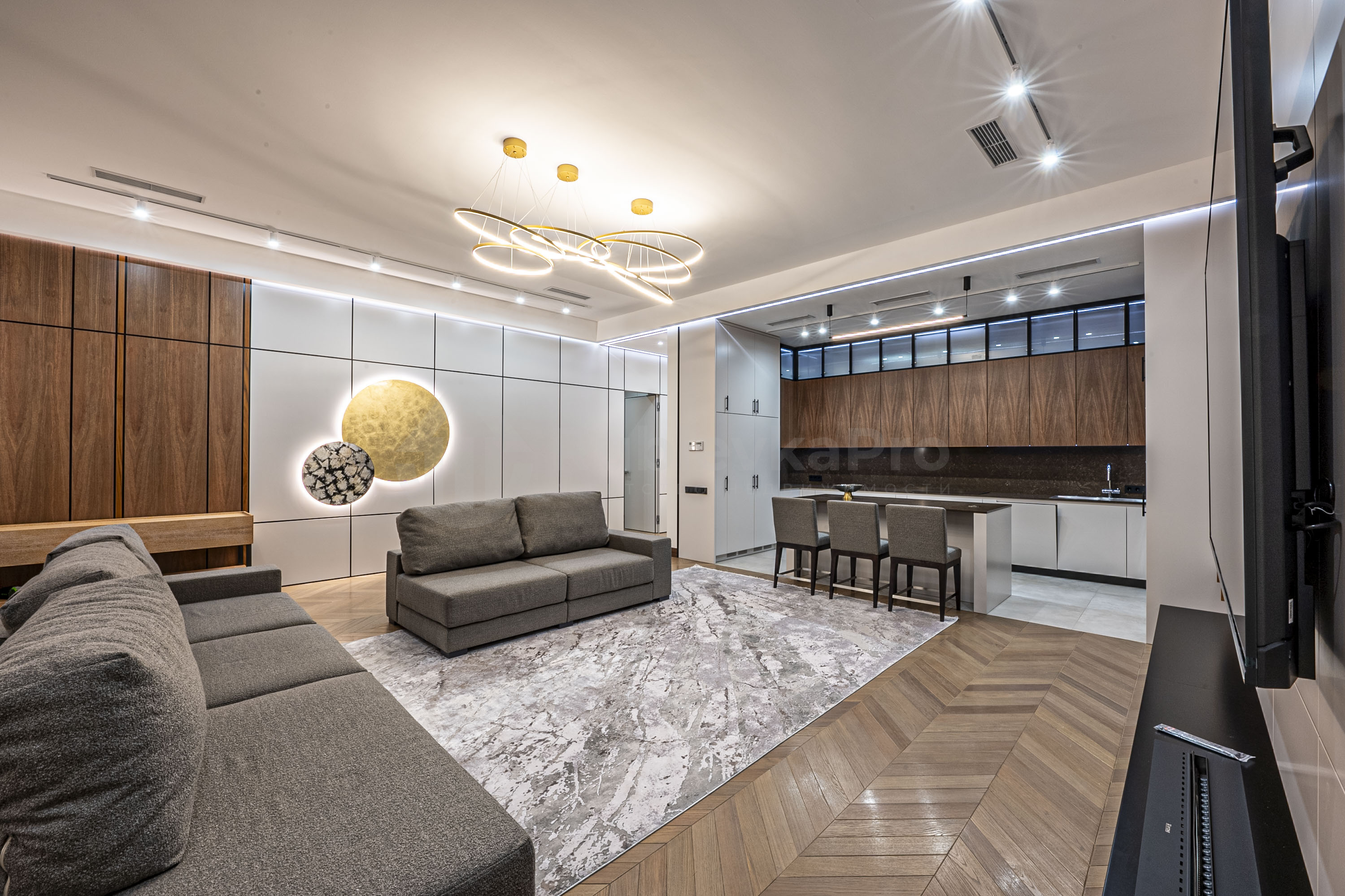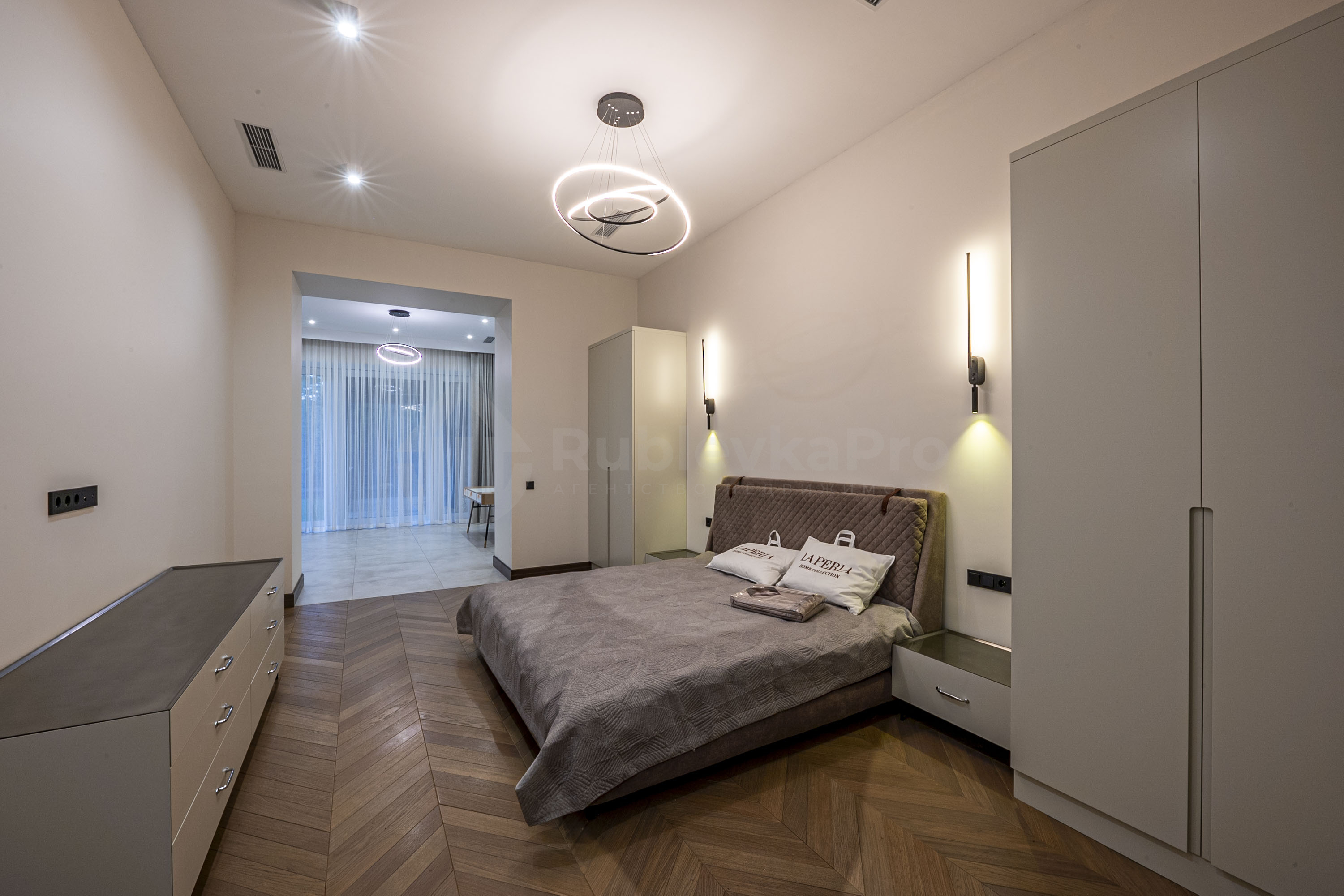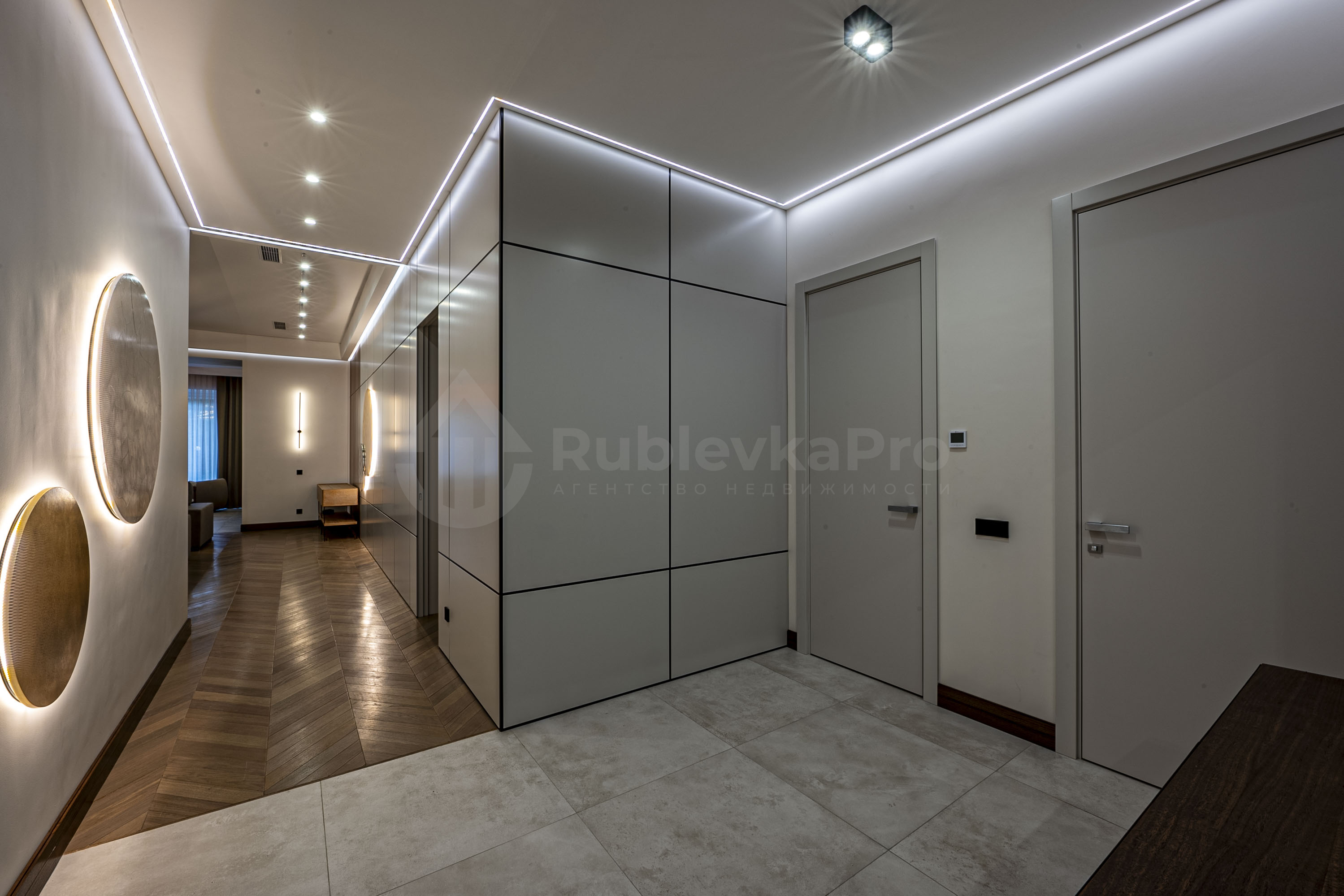 В квартире большая гостиная-столовая-кухня 70м2, две светлые спальни.со своими санузлами и кабинетами, гардеробная комната, гостевой санузел, просторная прихожая.