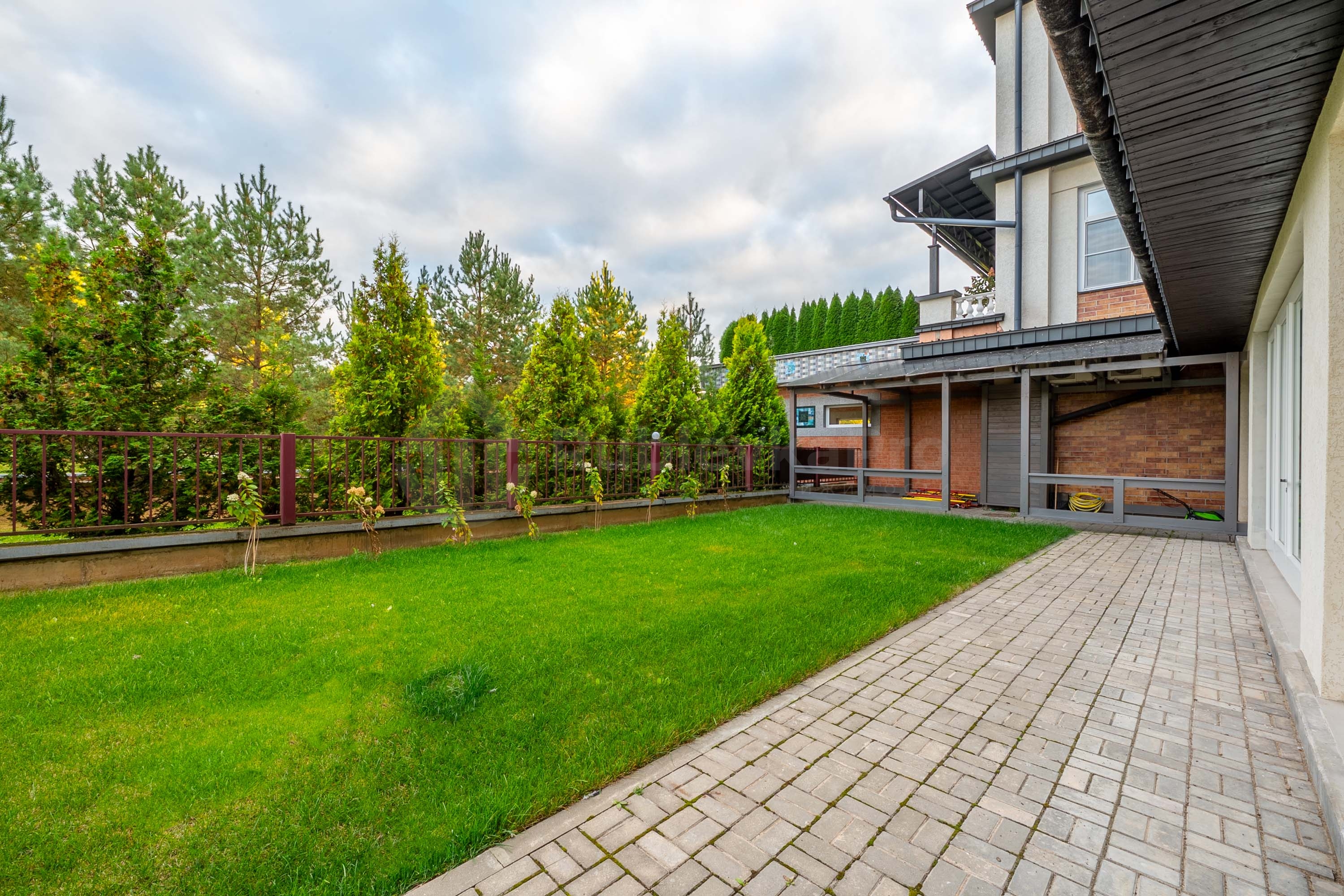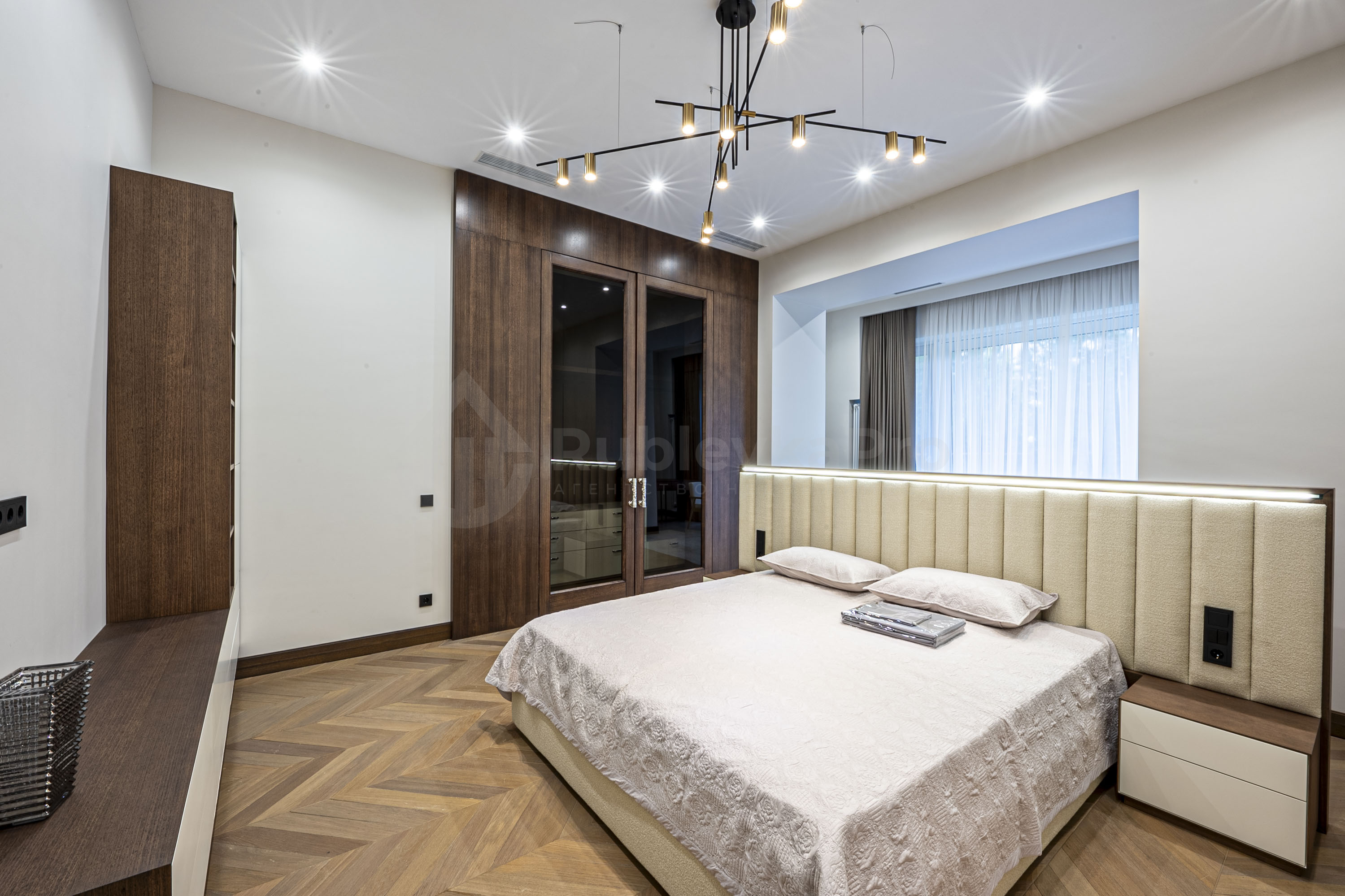 В квартире заканчивается дизайнерский ремонт из дорогих натуральных материалов - деревянные панели на стенах, дубовый паркет уложен французской елочкой, панорамные окна с выходом на участок.