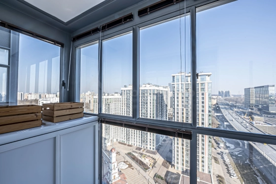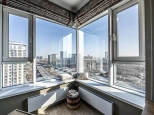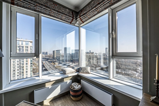 Угловое окно в гостиной с широкими подоконниками — зона отдыха с видом на город и парки.